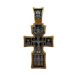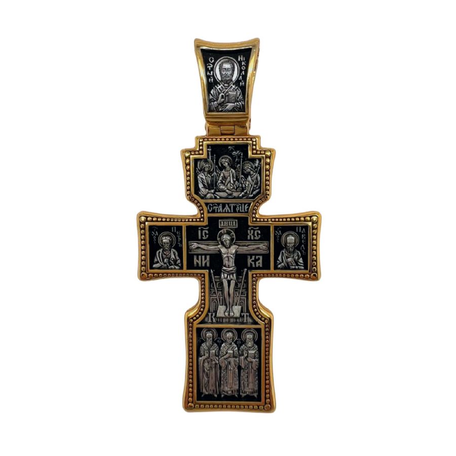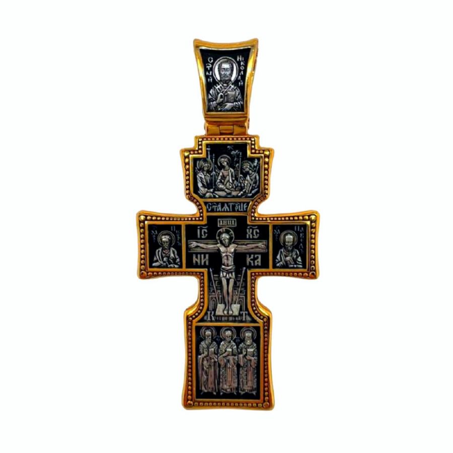 На лицевой стороне креста изображено Распятие Господа нашего Иисуса Христа. С двух сторон Ему предстоят в деисусе (молении за людей) Святые Апостолы Павел и Петр. Вверху- Пресвятая Троица. Это образ Триединого Бога, явившегося в виде трех Ангелов праотцу