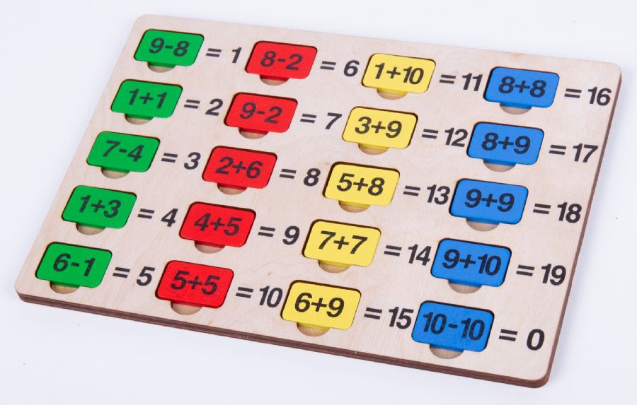 Данная игра представляет собой деревянную рамку с ответами, расположенными в четырёх столбиках по возрастанию. К каждому столбику предлагается набор примеров на сложение и вычитание на деревянных фишках, которые разделены на цвета: