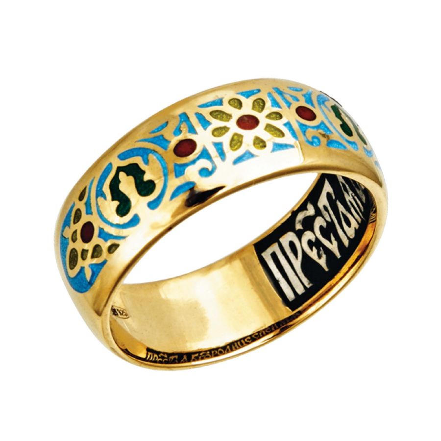 Цветочный орнамент, украшающий кольцо, составлен из восьмиконечных соцветий, так называемых «богородичных звезд» и трехлепестковых бутонов лилий, символизирующих Пресвятую Троицу.