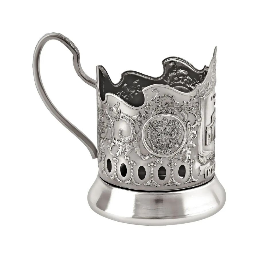 Подстаканник изготовлен из латуни покрыт никелем с чернением для цветового контраста.