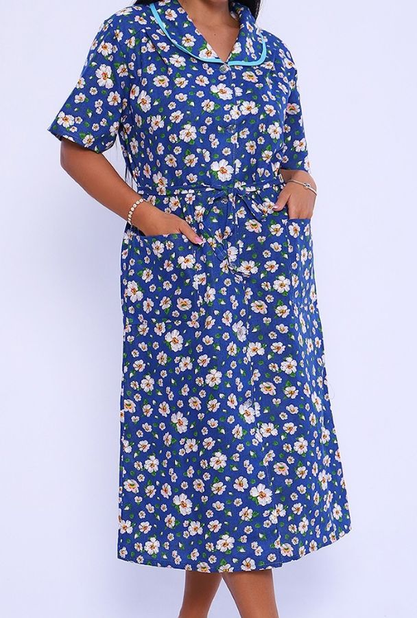 Халат из бязи. С кокеткой, короткий рукав чуть выше локтя, воротник с отделкой, пояс вкруговую, накладные карманы. Несколько вариантов расцветки, общая длина ниже коленей